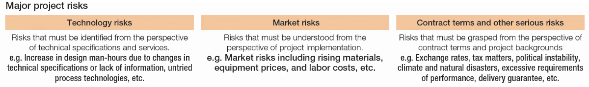 With recent projects at larger scales, changes in individual project profitability may greatly affect overall corporate profit or loss. Based on the recognition that suitably addressing risks is essential in managing projects, and accordingly, all team members involved in projects follow a risk management flow applying our original project management system and methods to respond to a variety of project risks for each role fulfilled and in each phase.