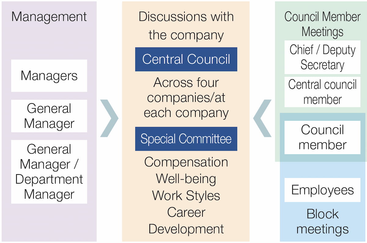 The JGC Council consists of the Central Council, a forum for direct dialogue between management and employees, and four Specialized Committees (Compensation, Well-being, Work Styles, Career Development), where each committee engages in deep discussions on their respective issues while maintaining continuity.