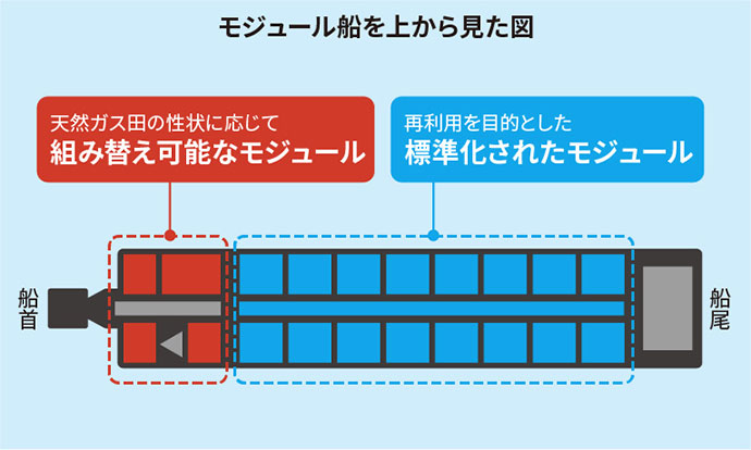 従来の多様な天然ガスの性状に応じて一品一様で設計する FLNG※では工期が長く、他の天然ガス田での再利用も難しいという課題があります。