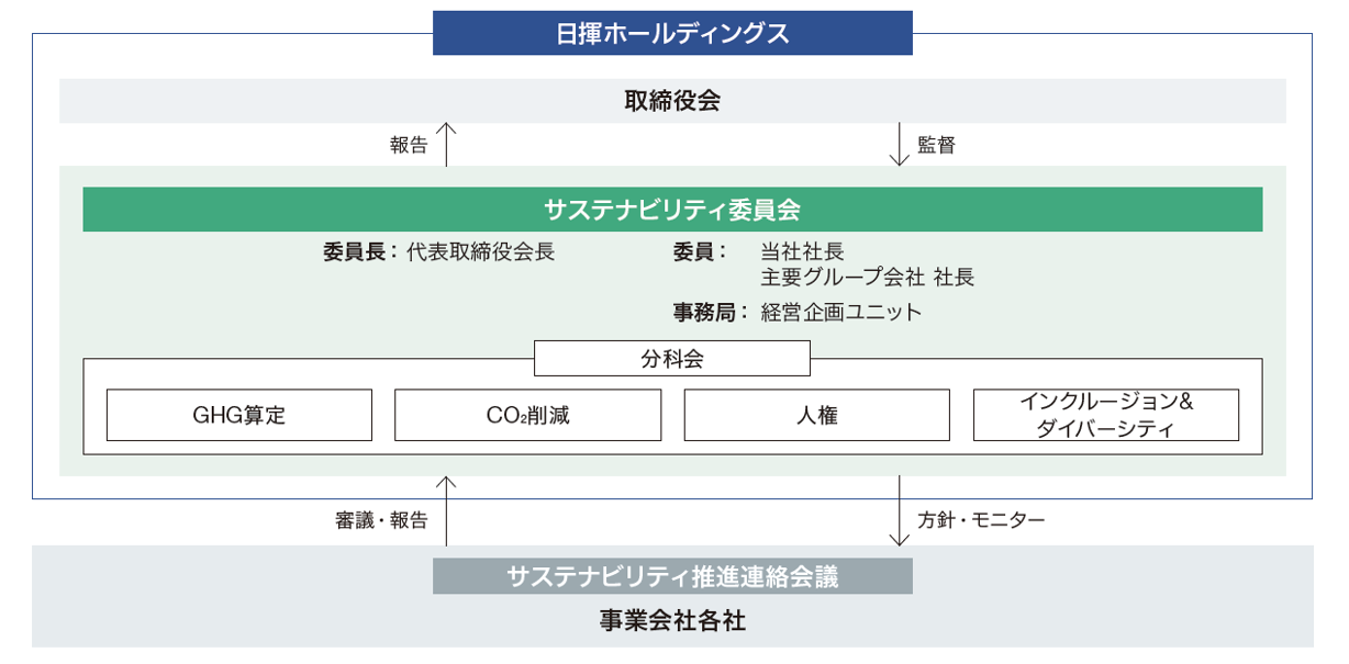 当社グループでは、代表取締役会長を委員長とするサステナビリティ委員会を設け、年3回の定例開催に加え、適時の臨時開催を通じて、気候変動をはじめとするサステナビリティ分野に関する方針や行動計画の策定、推進、評価および改善に係る審議を行うとともに、取締役会に対しては年1回の定期報告に加え、内容に応じた適時の附議・報告を行うこととしています。